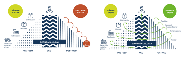 A través de la pirámide de valor (centro del gráfico), la empresa puede representar cómo se aporta o se pierde valor en cada etapa. En un modelo lineal las fases de la cadena en la etapa de pre-uso (diseño, fabricación, ensamblaje, distribución) van realizando aportaciones al valor del producto o servicio final. Este valor se maximiza al llegar a la etapa de uso y a partir de ahí empieza la concatenación de pérdidas de valor hasta llegar al residuo final. Esto no ocurre en la pirámide de valor de un modelo circular ya que en todas las etapas de la cadena se ha reflexionado sobre alternativas y opciones que aporten valor no sólo durante el pre-uso sino también durante el uso y fases posteriores. Utilizando herramientas como el Ecodiseño o el Análisis de Ciclo de Vida del producto y con la colaboración transversal de toda la organización se pueden visualizar nuevos escenarios y alternativas de diseño, producción y materiales que maximicen la circularidad del negocio.