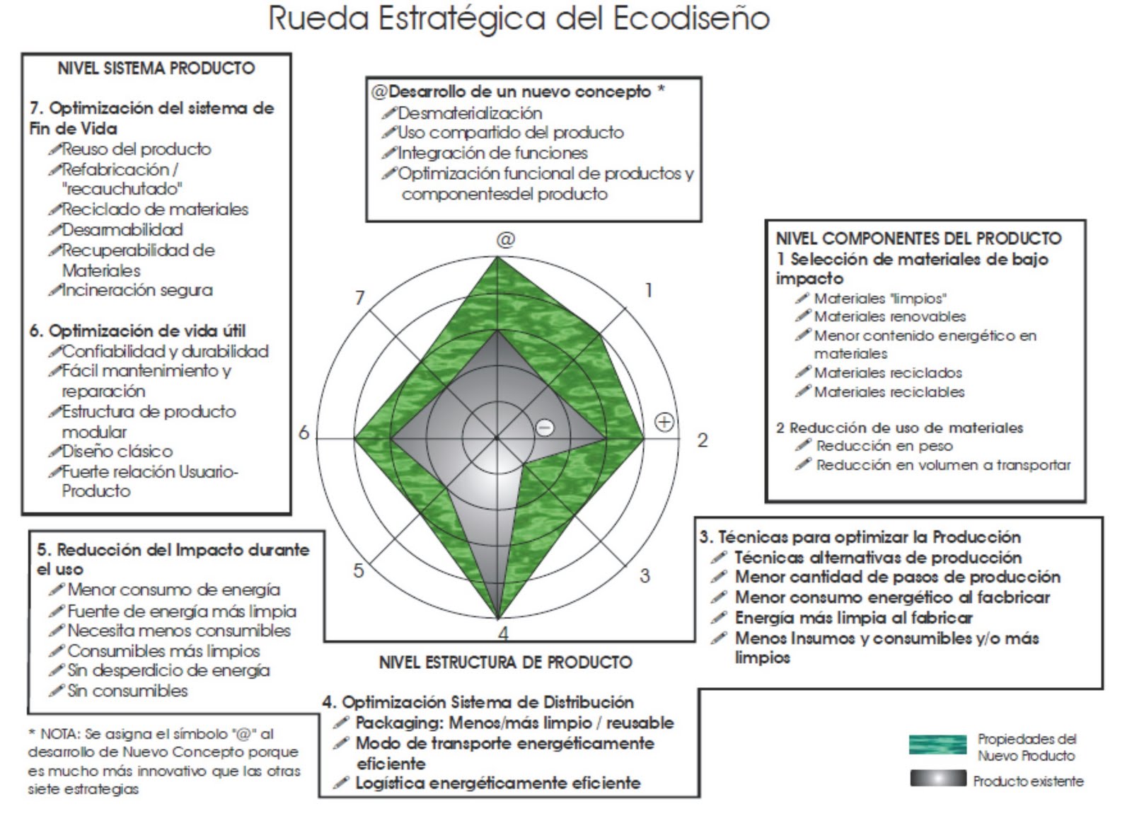 Una herramienta de gestión útil para integrar las estrategias de circularidad en la cadena de valor es la RUEDA ESTRATEGICA DEL ECODISEÑO o RUEDA DE LAS 8 ESTRATEGIAS o Rueda LiDS (Life Cycle Design Strategies) Van Hemel (1995), a través de ella podemos identificar las diferentes opciones basadas en los fundamentos de la economía circular que facilitan el rediseño e innovación necesarios para configurar las mejoras identificadas como claves en las fases del ciclo de vida analizadas: